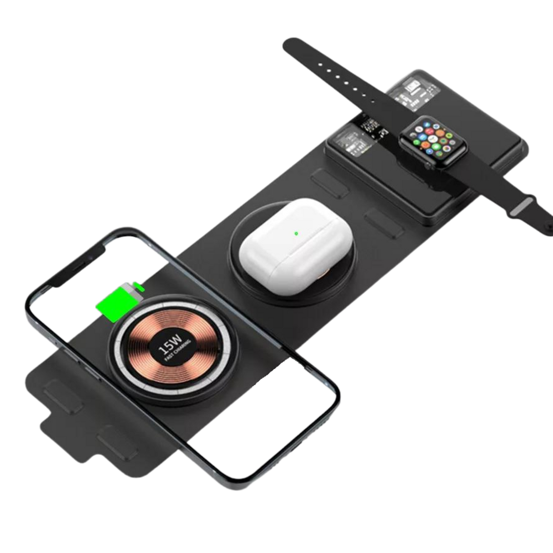 Prinášame vám bezdrôtovú nabíjačku 3 v 1 od značky KINGYARD, s ktorou môžete nabíjať hneď 3 elektronické prístroje naraz a maximalizovať tak váš čas. S bezdrôtovou nabíjačkou je možné nabíjať akékoľvek zariadenie podporujúce bezdrôtové nabíjanie. Najčastejšie zariadenia vhodné pre bezdrôtové nabíjanie sú chytré hodinky , slúchadlá a chytré mobilné telefóny . Bezdrôtová nabíjačka je rozdelená na 3 hlavné časti, MagSafe, klasické bezdrôtové nabíjanie pre chytré telefóny a slúchadlá, a nabíjanie určené pre chytré hodinky.