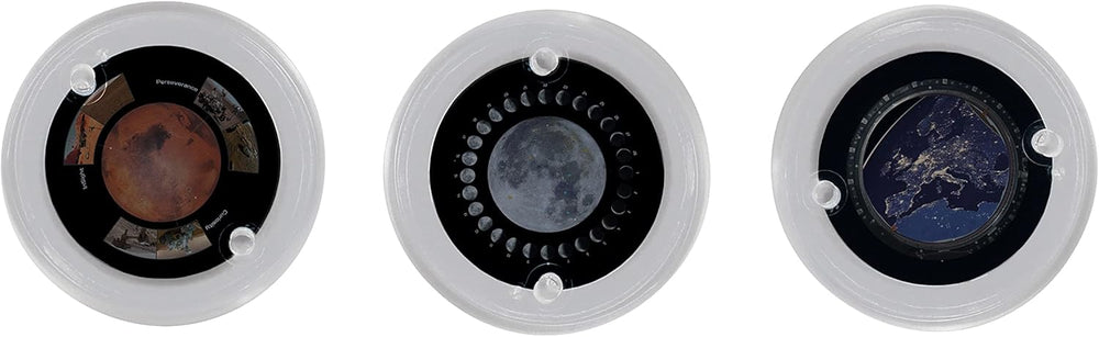 Rozšírte možnosti vášho Buki planetária (model 8002) s touto sadou náhradných diskov! Tento set obsahuje tri nové disky, ktoré obohatia vašu oblohu o nové fascinujúce pohľady na vesmír. Objavte krásy Mesiaca, jeho fázy, krátery a more, alebo sa pozrite na úchvatné satelitné snímky Európy z vesmíru. Nezabudnite ani na Mars a jeho robotov, ktorí sa vydali na prieskum tejto tajomnej planéty.