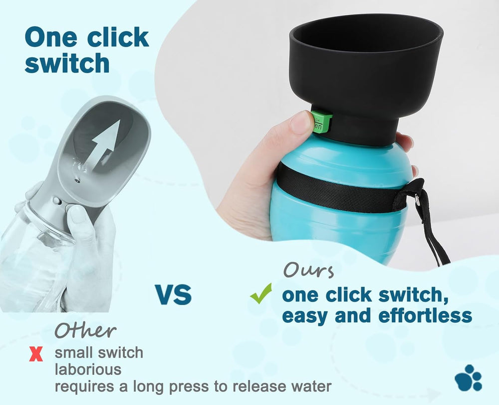 Integrovaný design v tvare fľaše + miska na vodu. Skladací uzáver sa po rozložení stane miskou na vodu. Vyhnite sa jazernej vode a verejným miskám na vodu, aby ste svojmu miláčikovi dali vždy čerstvú vodu. Fľaša je vyrobená z odolných, ale ľahkých materiálov, čo zaisťuje ľahké prenášanie.
