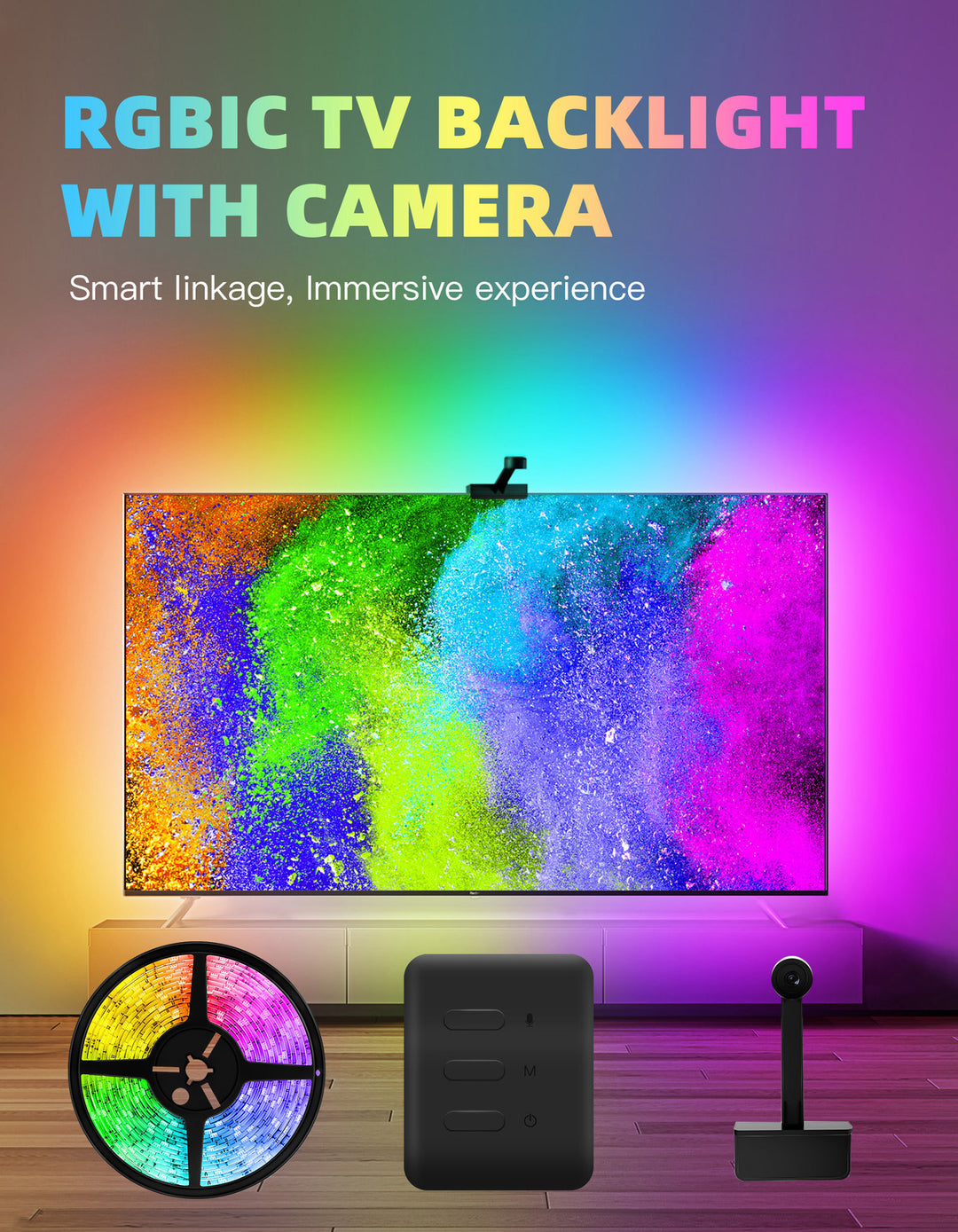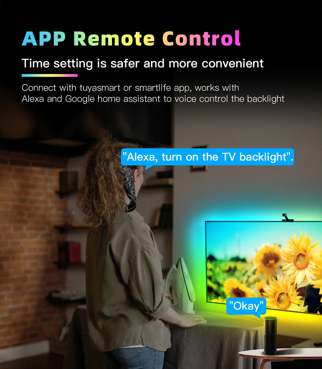Predstavujeme chytré LED osvetlenie určené na TV či stolný počítač. Osvetlenie je vybavené snímacou kamerou, ktorá aktívne sníma obraz televízora, alebo monitora a dokonale premieta farby na zadnú plochu. Osvetlenie sa jednoducho inštaluje a všetko je možné nastaviť pomocou aplikácie Tuya Smart, alebo Smart Life, ktorá je dostupná na stiahnutie pre inteligentné zariadenia so systémom iOS a Android. Tento produkt tiež ponúka hlasové ovládanie pri prepojení s príslušnými hlasovými asistentmi.