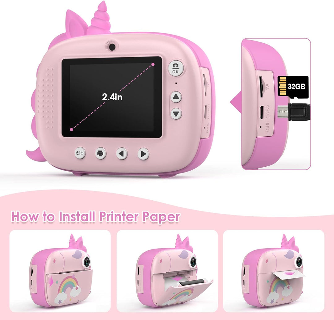 Termopapier, ktorý sa používa na tlač fotografií je vhodný pre fotoaparáty rôznych značiek. Inštalácia je veľmi jednoduchá, deti len musia dbať na správne vloženie papiera. Pri zatváraní zadného viečka je dôležité nechať zhruba 2 cm papiera vyčnievať von, aby sa fotografie správne vytlačili.