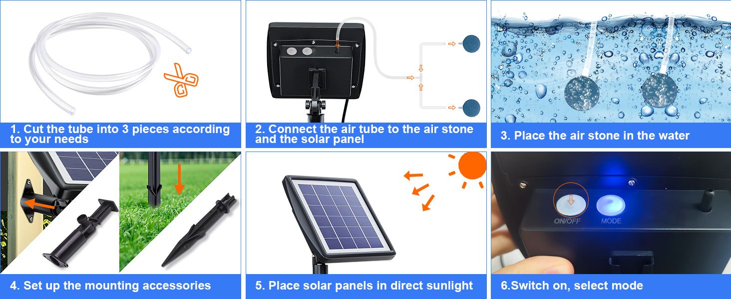 Zariadenie je navrhnuté pre jednoduchú montáž – solárny panel je možné zapichnúť do zeme alebo pripevniť na stenu , vzduchovací kameň sa pripojí hadičkou a okamžite začne pracovať.