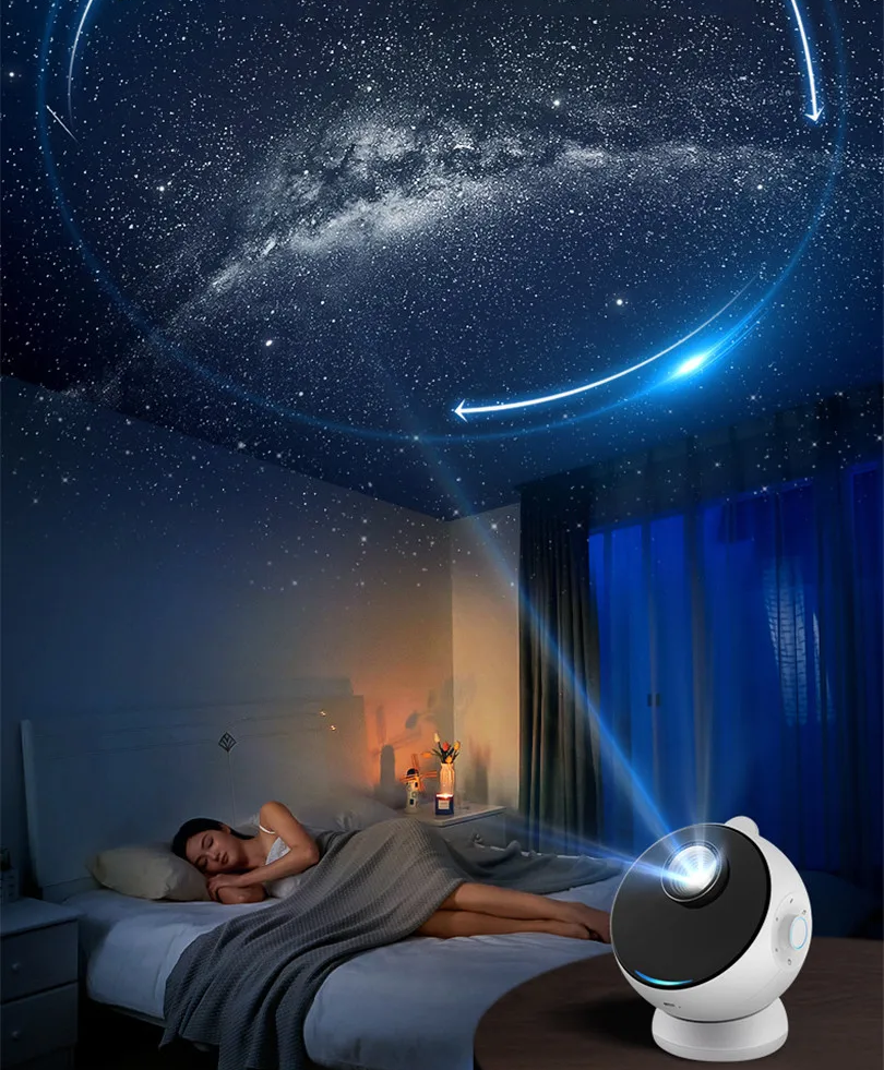 Projektor galaxie vytvára projekciu galaxií, planét, hviezd a vesmírnych hmlovín. Projektor môže pomôcť deťom i dospelým rozšíriť znalosti a povedomie o existencii vesmíru. Tento projektor galaxie je unikátny svojim futuristickým vzhľadom, kvalitou a najmä špeciálnou funkciou, ktorá pri projekcii kozmických telies umožňuje spustiť simuláciu padajúcej hviezdy. Táto špeciálna funkcia dokáže pri projekcii vytvoriť skutočné prostredie vesmíru a maximalizuje tak váš zážitok. Projektor funguje pomocou 12-tich kaziet, ktoré sa jednotlivo zasúvajú dovnútra projektora. Potom sa pomocou spúšťacieho tlačidla aktivuje a tým spustiť projekciu.