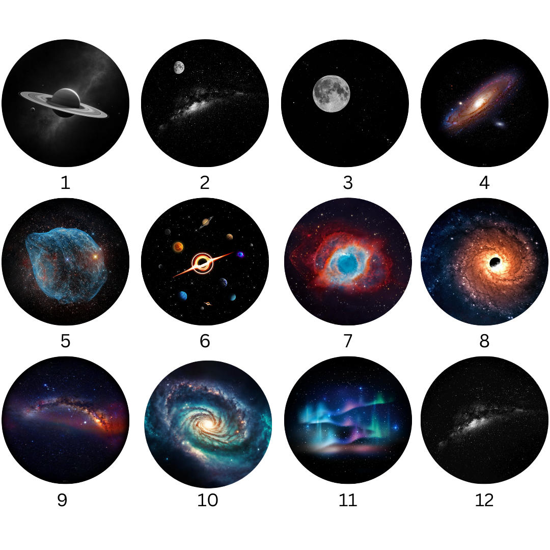 12 vymeniteľných kaziet/diskov: Planetárium ponúka množstvo diskov, ktoré je možné vložiť priamo do projektora a premietať tak realistické obrazy galaxií, planét a hviezd. Všetky snímky sú založené na skutočných teleskopických fotografiách.