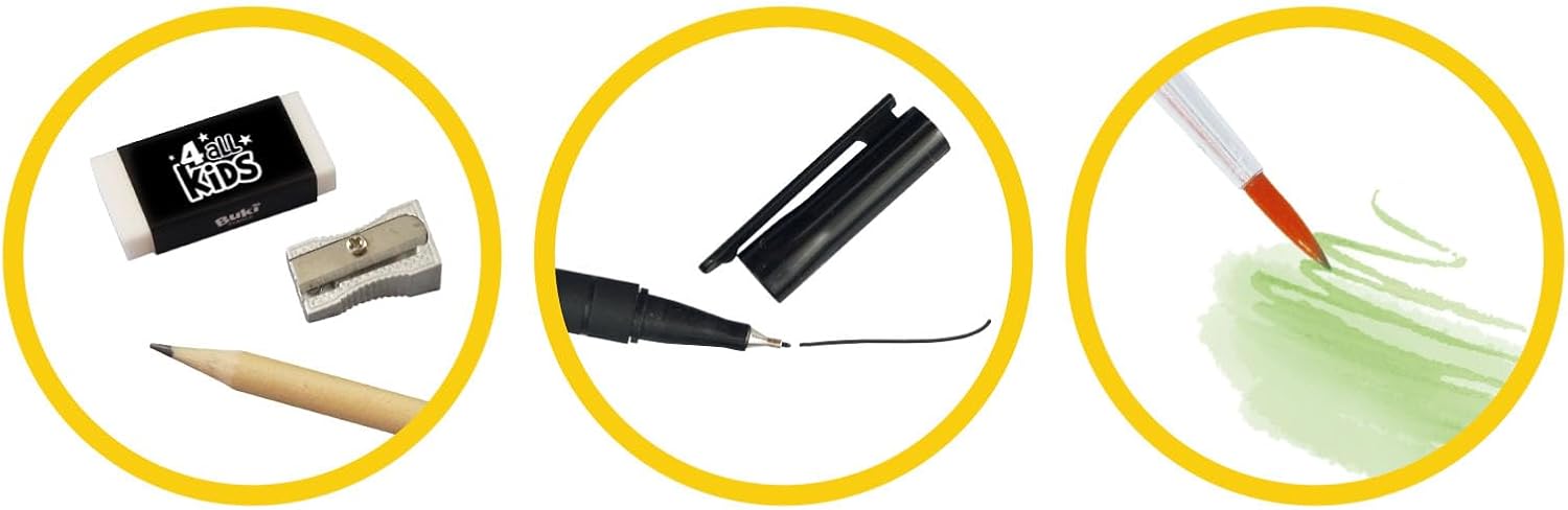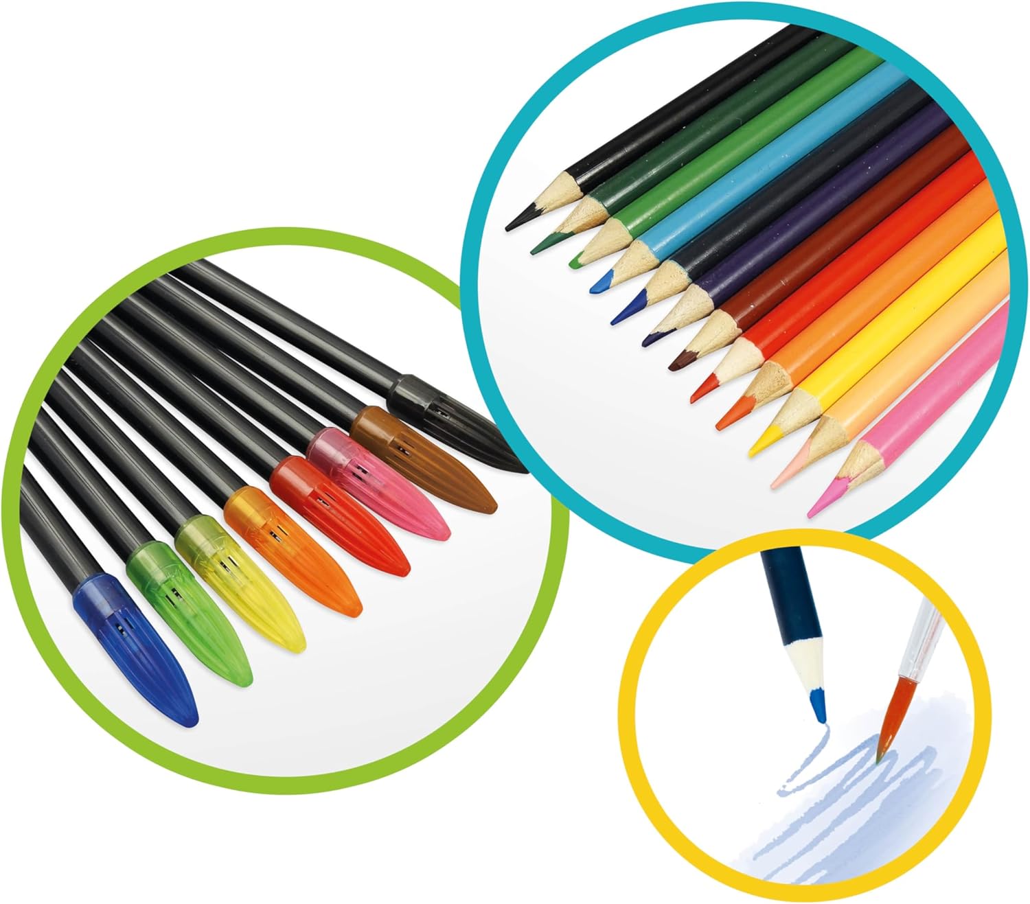 Součástí balení je vše, co dítě ke kreslení potřebuje: 12 akvarelových pastelek, 8 fixů, tužka, liner, guma, ořezávátko, štětec, papíry formátu A4 i A5, záložky i pětimetrový plakátový papír. Není potřeba nic dokupovat – stačí vložit baterie a začít tvořit!