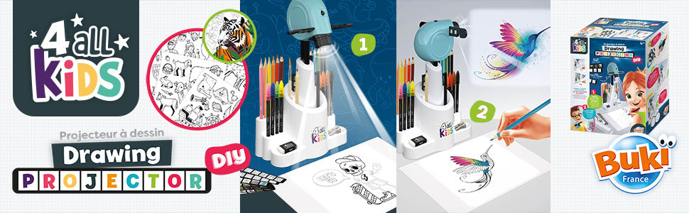S projektorem BUKI FK004 zvládne každý malý umělec vytvořit úžasné obrázky! Promítej černobílé obrysy na papír, obkresli je a poté promítej barevný motiv, který ti pomůže s vybarvováním. Jednoduché, zábavné a s kouzelným výsledkem – přesně tak, jak si to děti zamilují.