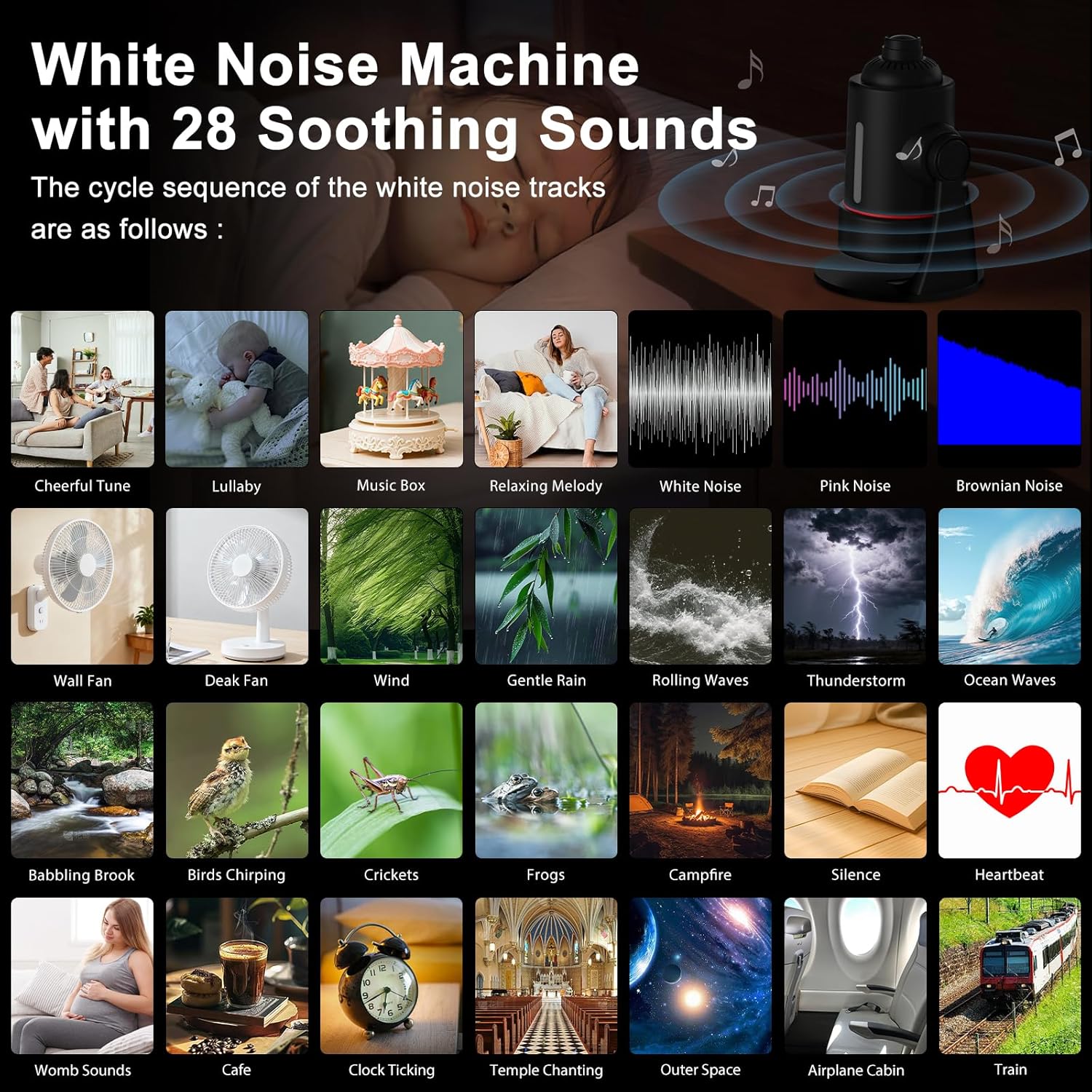 Vybrať si môžete z celej škály upokojujúcich zvukov – od jemného dažďa a oceánskych vĺn, cez biely šum a spev vtákov, až po praskanie táborového ohňa, dunenia vlaku či nežnej uspávanky.