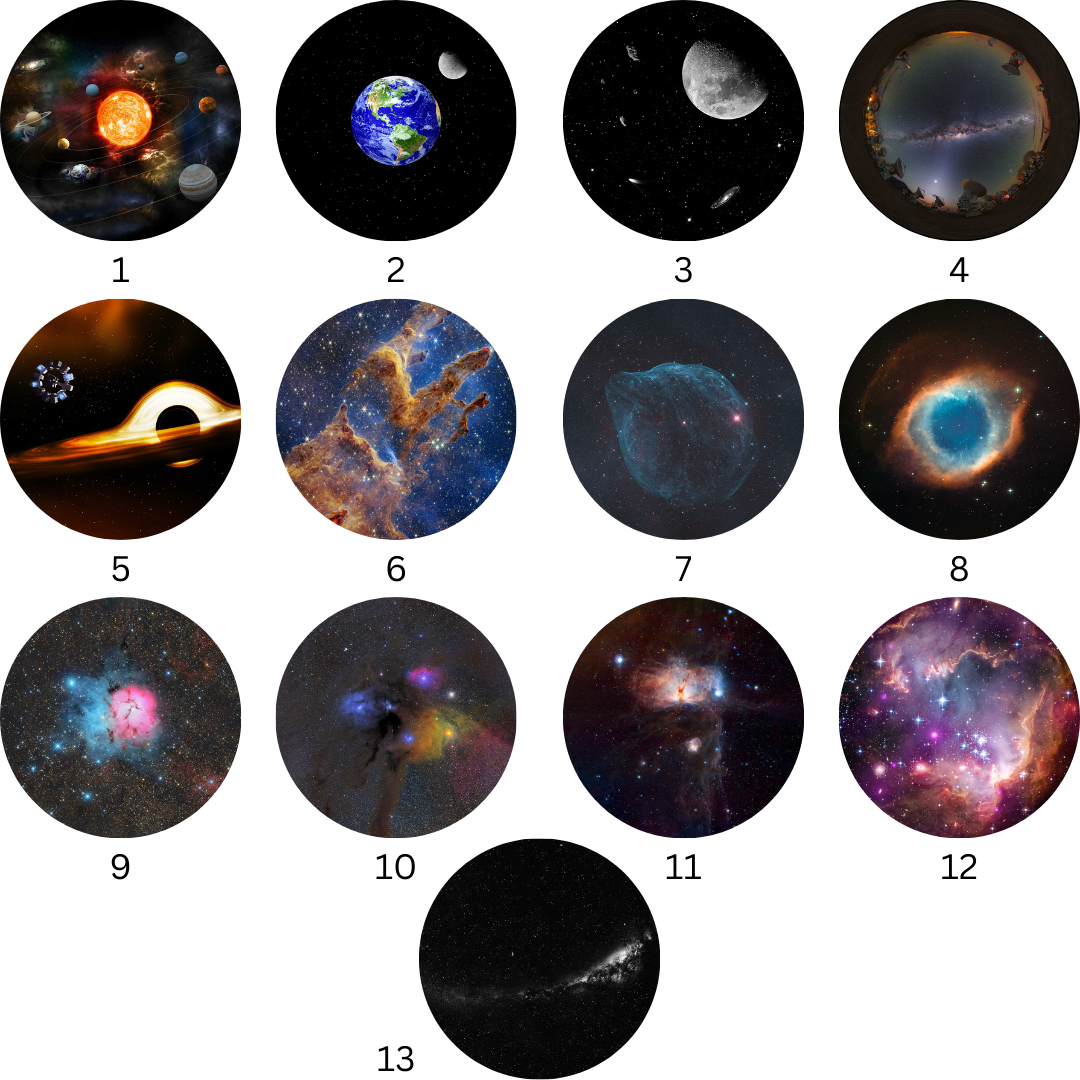 • 13 vymeniteľných diskov: Projektor obsahuje 13 vymeniteľných diskov: Slnečná sústava, Krajina, Mesiac, Galaxia Mliečna dráha, Čierna diera, Piliere stvorenia, Hmlovina Delfín - Sharpless 308, Hmlovina Helix - NGC 7293, Hmlovina Trifid, Starry Sky Palette - Rho Ophiuchi Cloud Complex, Mlh snímka galaxie Mliečna dráha (nachádza sa vo vnútri projektora). Tieto disky sa jednotlivo vkladajú do projektora, ktorý vďaka nim premieta galaxie, planéty, hviezdy a kozmické hmloviny. Projekcia vesmíru a nebeských telies je vytvorená na základe reálnych snímok urobených teleskopy.