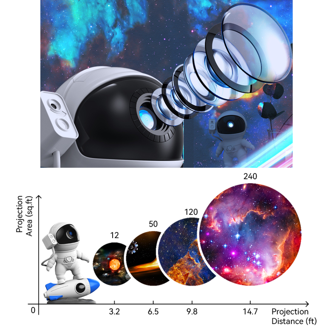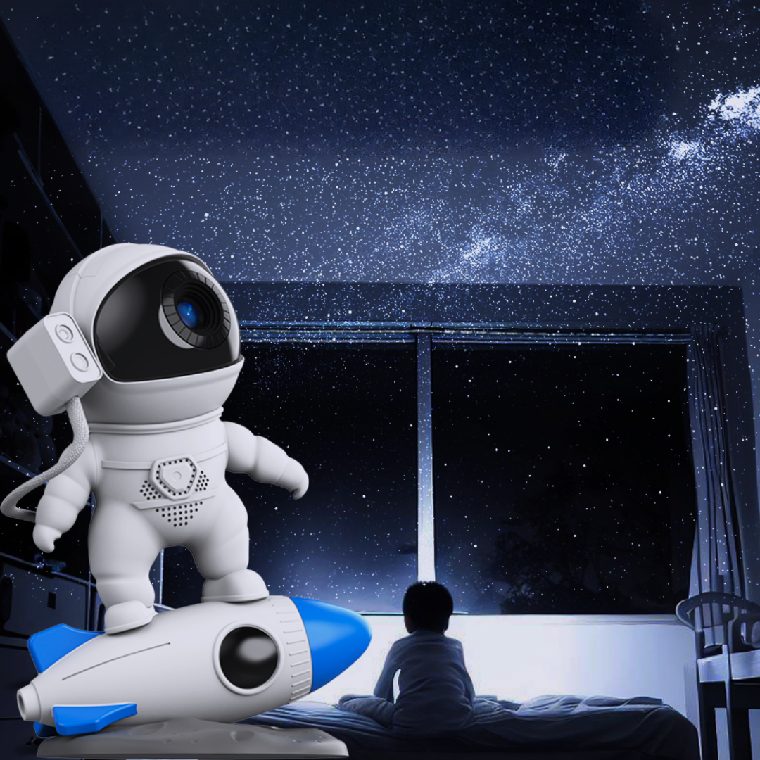 Projektor v štýle kozmonauta (4. generácie) s LED osvetlením vytvára projekciu galaxie, planét, hviezd a vesmírnych hmlovín a môže pomôcť deťom rozšíriť ich znalosti a povedomie o existencii vesmíru. Projektor funguje pomocou 13-tich kaziet, ktoré je možné ľubovoľne zasunúť dovnútra projektora a tým spustiť projekciu požadovanej galaxie a rôznych vesmírnych telies.