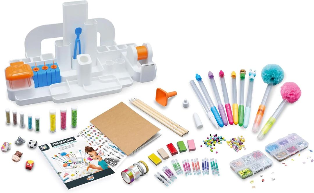 S touto kreatívnou sadou od BUKI si deti môžu vytvoriť jedinečné písacie perá presne podľa svojej fantázie. Súprava ponúka všetko, čo potrebujú na to, aby si navrhli, ozdobili a prispôsobili nielen perá, ale aj ceruzky, gumy alebo zápisník. Stačí vložiť pero do stojana, pridať farebné dekorácie, nálepky alebo trblietky a originálny kúsok je na svete!