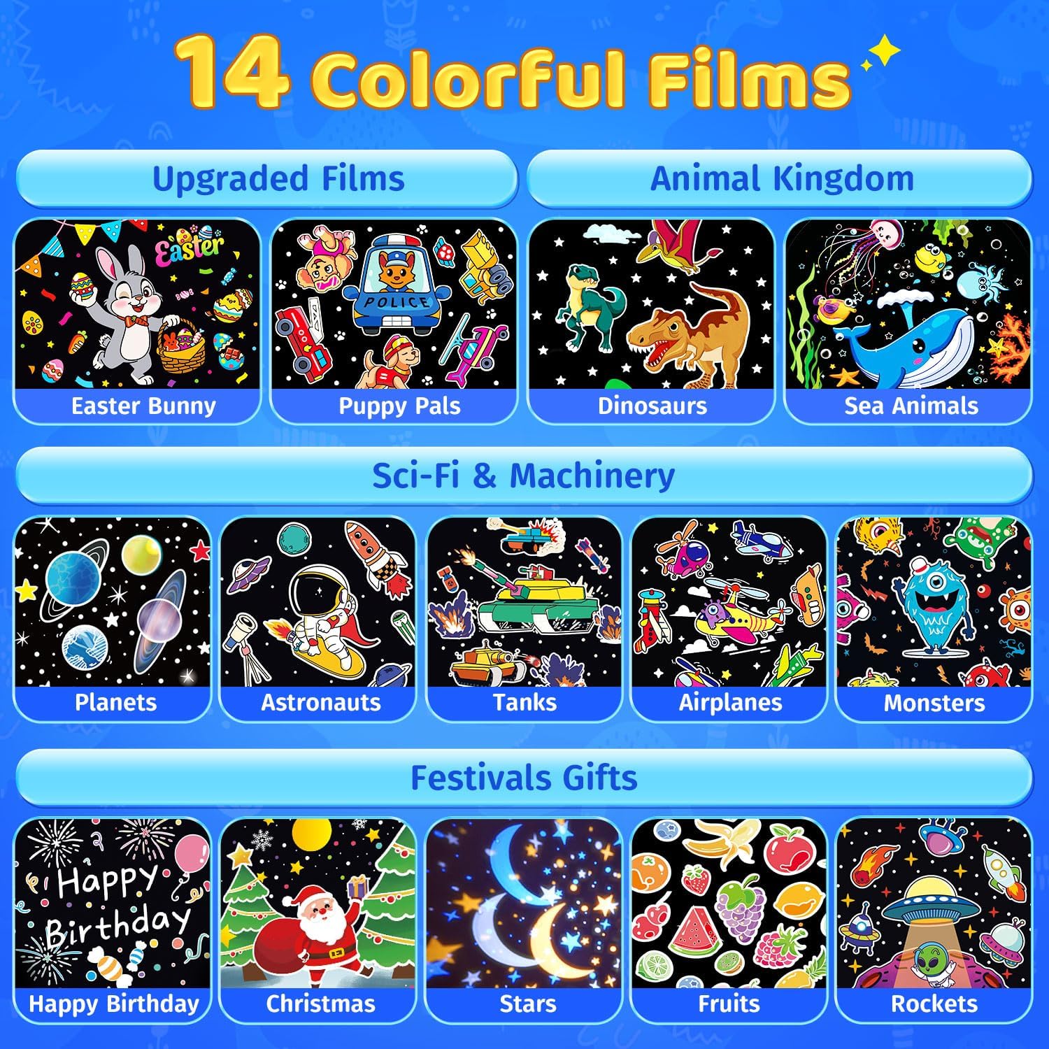 Projektor nabízí 14 vyměnitelných filmů s různými tématy, například: