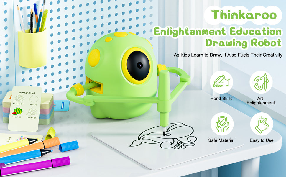 Objevte nekonečné možnosti tvoření s malovacím robotem Thinkaroo, který přináší dětem více než jen zábavu. S 150 barevnými kartami rozdělenými do 12 kreativních témat se učení mění ve hru plnou fantazie, barev a objevování.