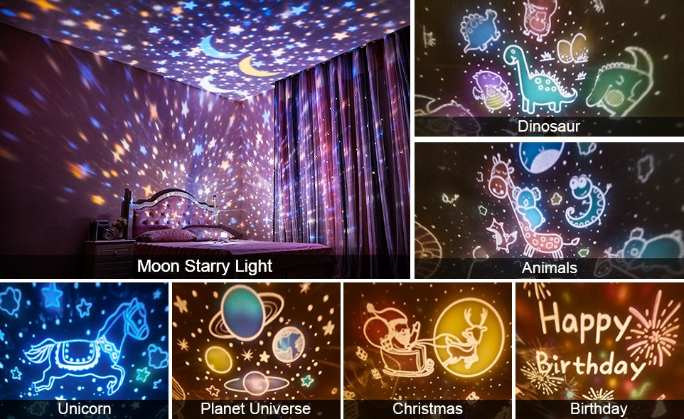 Projektor je možné nastaviť do požadovanej polohy vďaka rotačnému panelu, na ktorom je projektor umiestnený. Vďaka tejto 360 ° rotácii sa všetky projekcie pohybujú, takže prinesie vašim deťom nekonečne možností na vytváranie kúzelných priestorov pred spaním. Vďaka tomu poskytuje nezabudnuteľný zážitok, ktorý rozvíja detskú predstavivosť a posilňuje ich spojenie s vesmírnym, oceánskym a zvieracím dobrodružstvom.