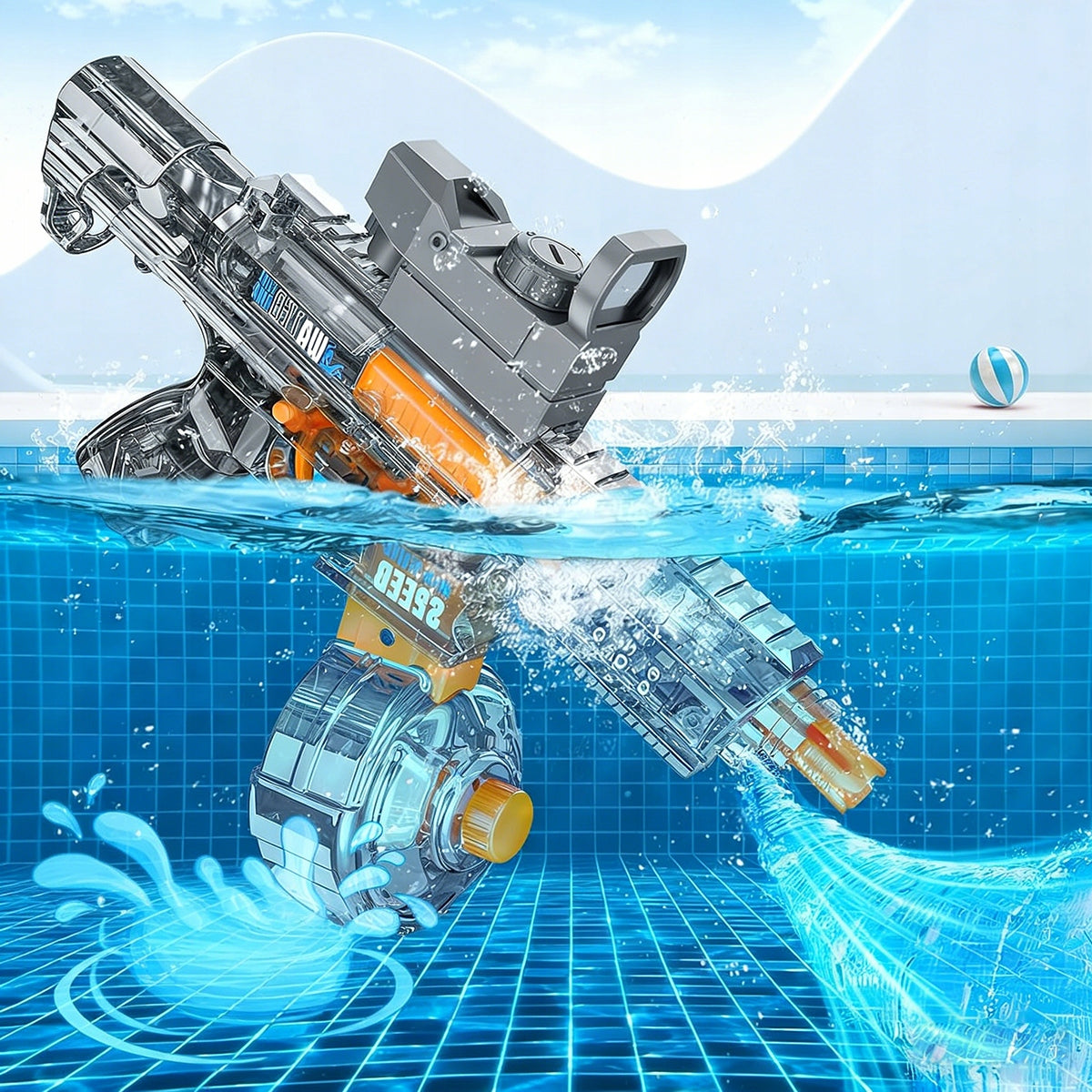 Zažijte úplně novou úroveň letní zábavy! Model UMP45 značky Battle je moderní elektrická vodní pistole se světelnými efekty, automatickým plněním a silným dostřelem až 10 metrů. Ideální pro zahradu, dovolenou, bazén i vodní bitvy s přáteli. Díky revoluční funkci automatického nasávání vody jedním tlačítkem nemusíte sundávat zásobník – stačí ponořit do vody a pokračovat v akci.