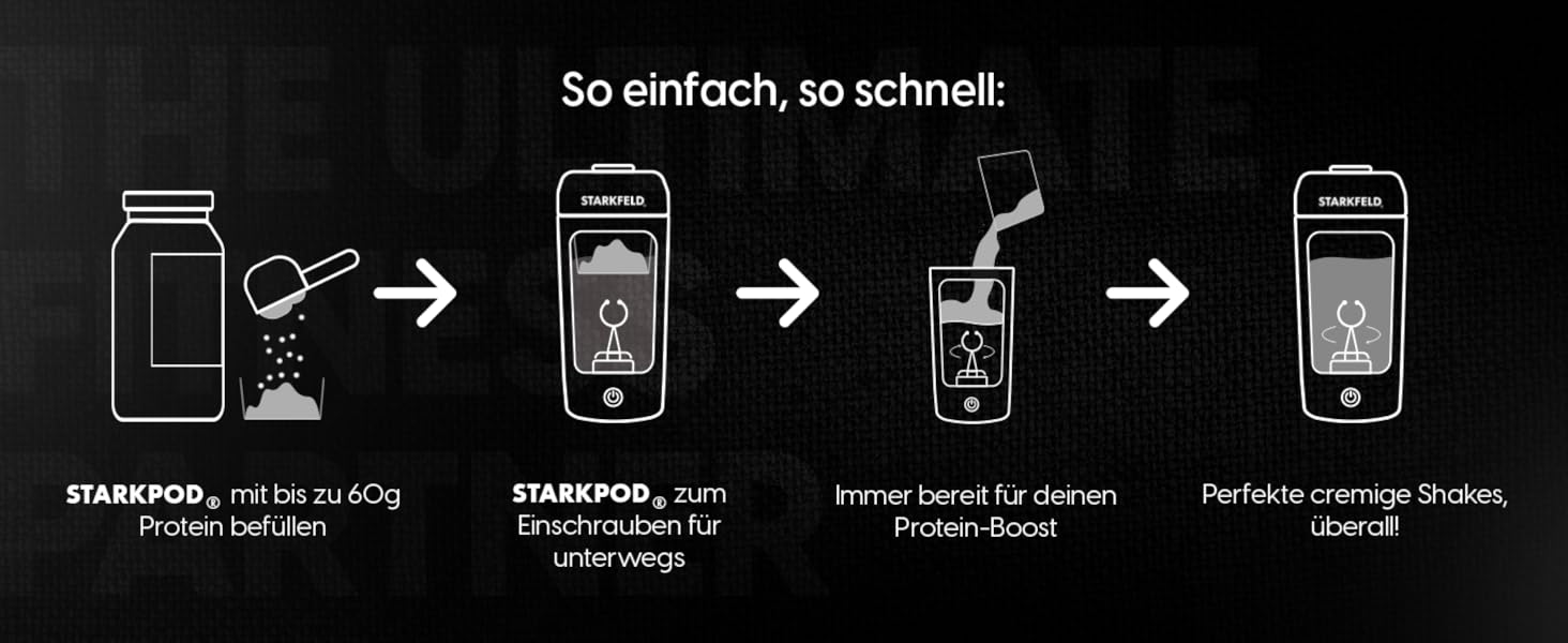 STARKSHAKE se pyšní výkonným motorem, který bez problémů rozmixuje jakýkoliv proteinový prášek do hladké konzistence. Už žádné hrudky nebo neprosmíchané kousky – každý nápoj bude dokonale hladký a lahodný, což vám umožní plně si vychutnat skutečnou chuť vašeho proteinu.