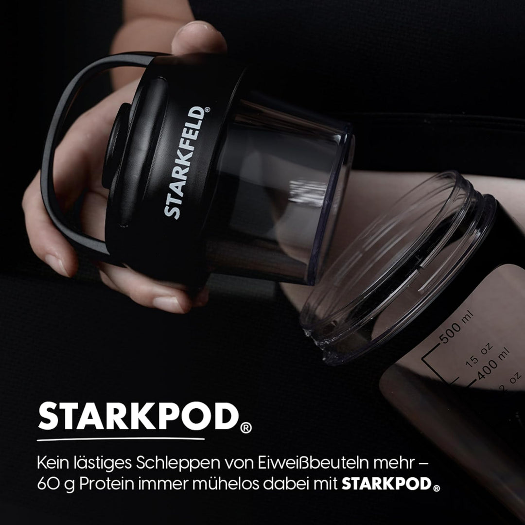 Šejkr STARKSHAKE je vybaven nádobou s kapacitou na 60g proteinu, což je dostatečné množství pro přípravu vašeho oblíbeného proteinového nápoje. Tato velikost umožňuje namíchat dostatečně silný nápoj pro maximální regeneraci a růst svalů, aniž byste museli neustále doplňovat prášek.