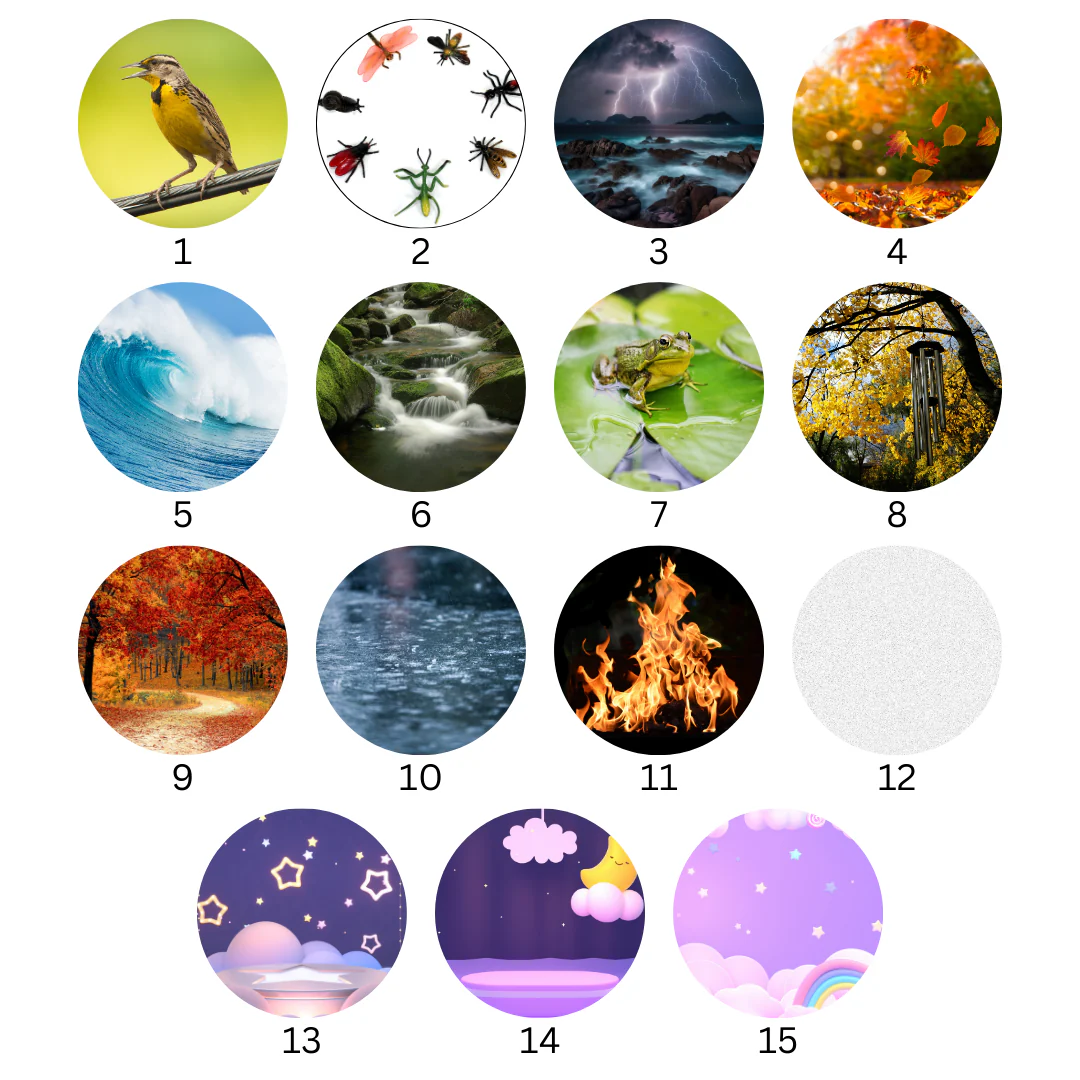• zpěv ptáků, zvuky hmyzu, blesky, padající listí, mořské vlny, tekoucí voda, kvákání žab, zvonkohra ve větru, podzimní atmosféra, déšť, praskání ohně, bílý šum, ukolébavka 1, ukolébavka 2, ukolébavka 3