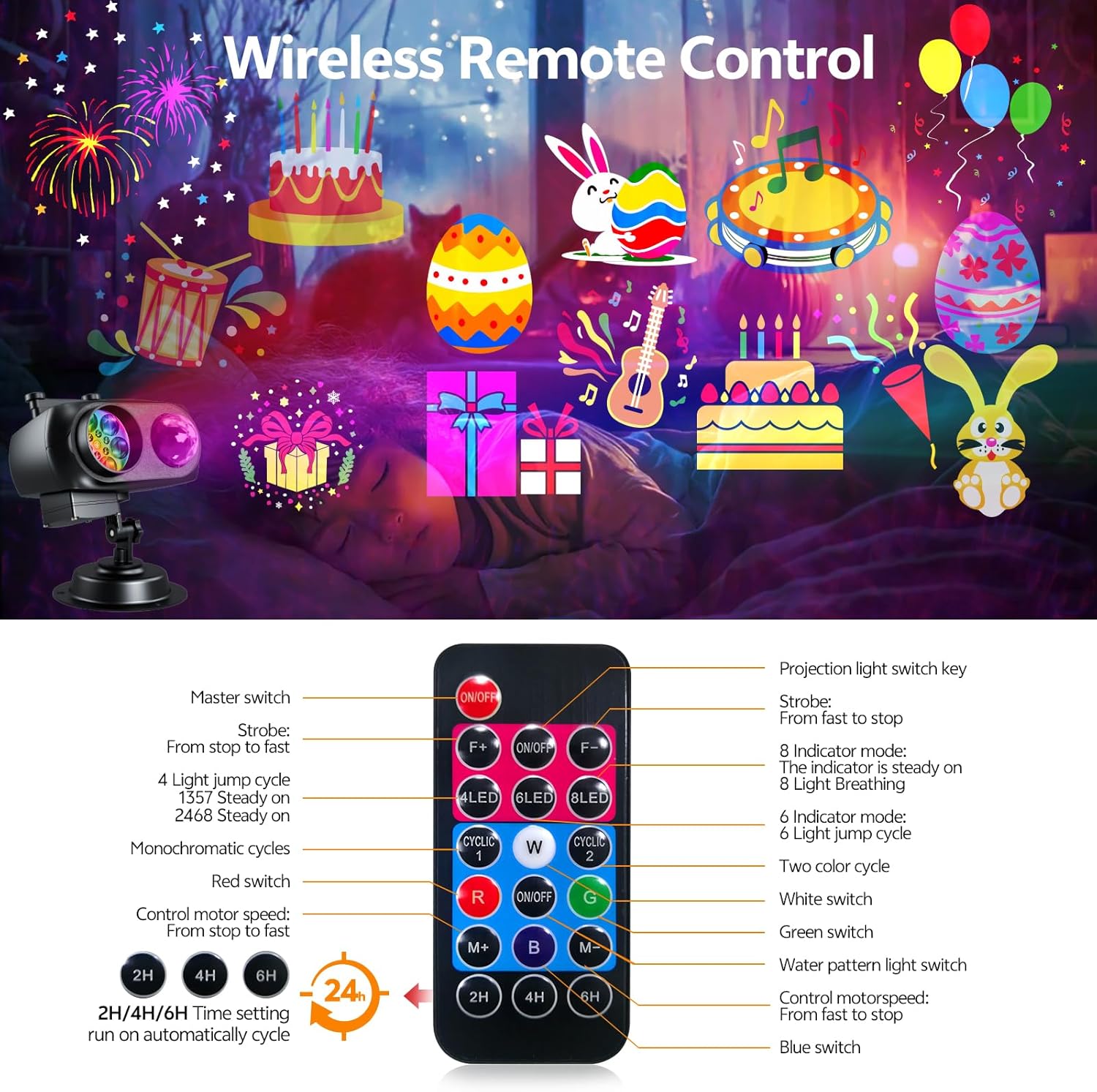 Pomocou priloženého diaľkového ovládania ľahko prepnete motívy, farby, rýchlosť alebo blikanie efektov. Môžete tiež nastaviť časovač a nechať projektor automaticky vypnúť - bez nutnosti ručného zásahu.