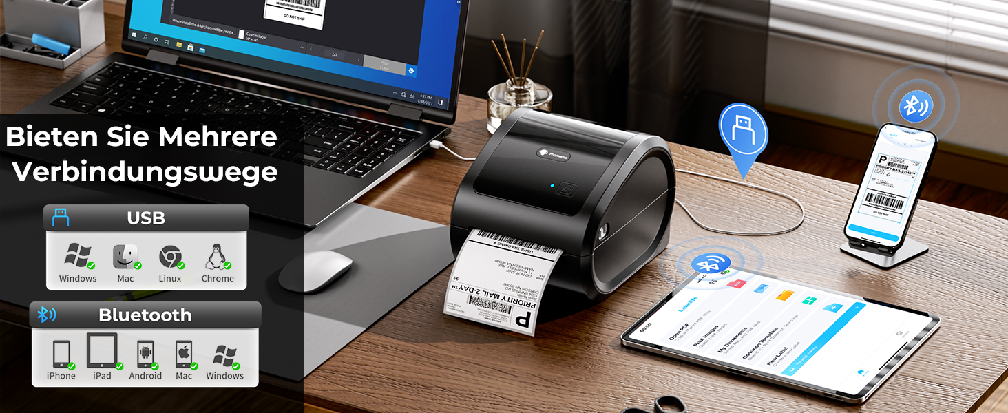 Tlačiareň Phomemo D520BT ponúka flexibilné možnosti pripojenia na pohodlné použitie. Cez Bluetooth sa ľahko prepojí s mobilnými zariadeniami (iOS, Android) prostredníctvom aplikácie Labelife , ktorá umožňuje rýchlu úpravu a tlač štítkov priamo z telefónu alebo tabletu. Pre tých, ktorí preferujú tlač z počítača, je tu USB pripojenie , kompatibilné s Windows, macOS, ChromeOS a Linuxom .