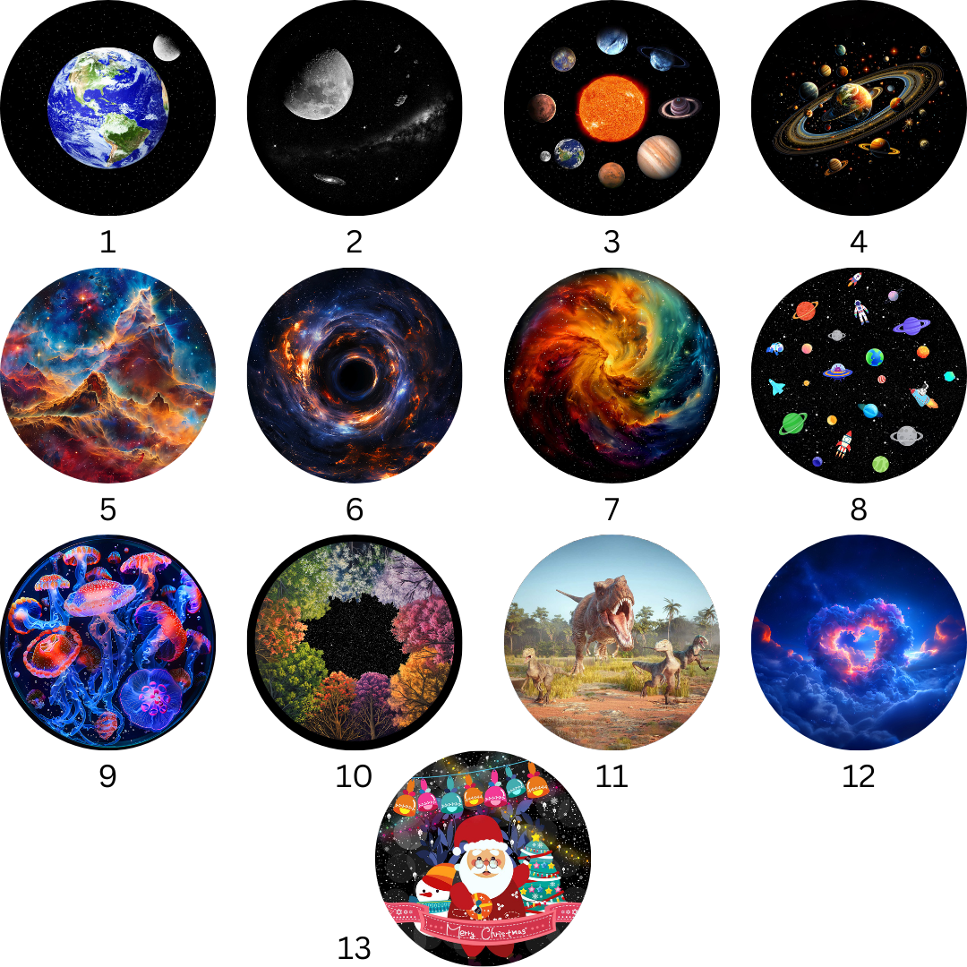 Projektor funguje pomocou kaziet s rôznymi snímkami, ktoré sa jednotlivo zasúvajú dovnútra projektora a vytvárajú projekcie galaxií, planét, hviezd, vesmírnych hmlovín, morských živočíchov a ďalších snímok.