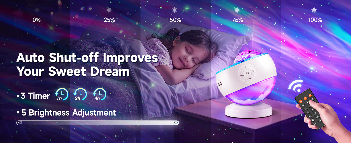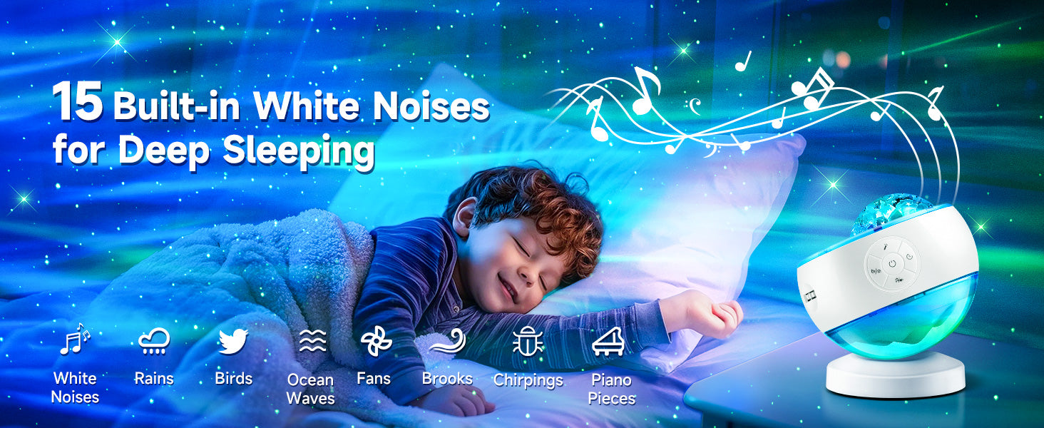 Integrovaných 15 režimů bílého šumu a přírodních zvuků (déšť, mořské vlny, jemné ambientní tóny) pomáhá rychleji usnout, zklidnit mysl a zlepšit kvalitu spánku. Kombinace světla a zvuku vytváří perfektní podmínky pro relaxaci dětí i dospělých.